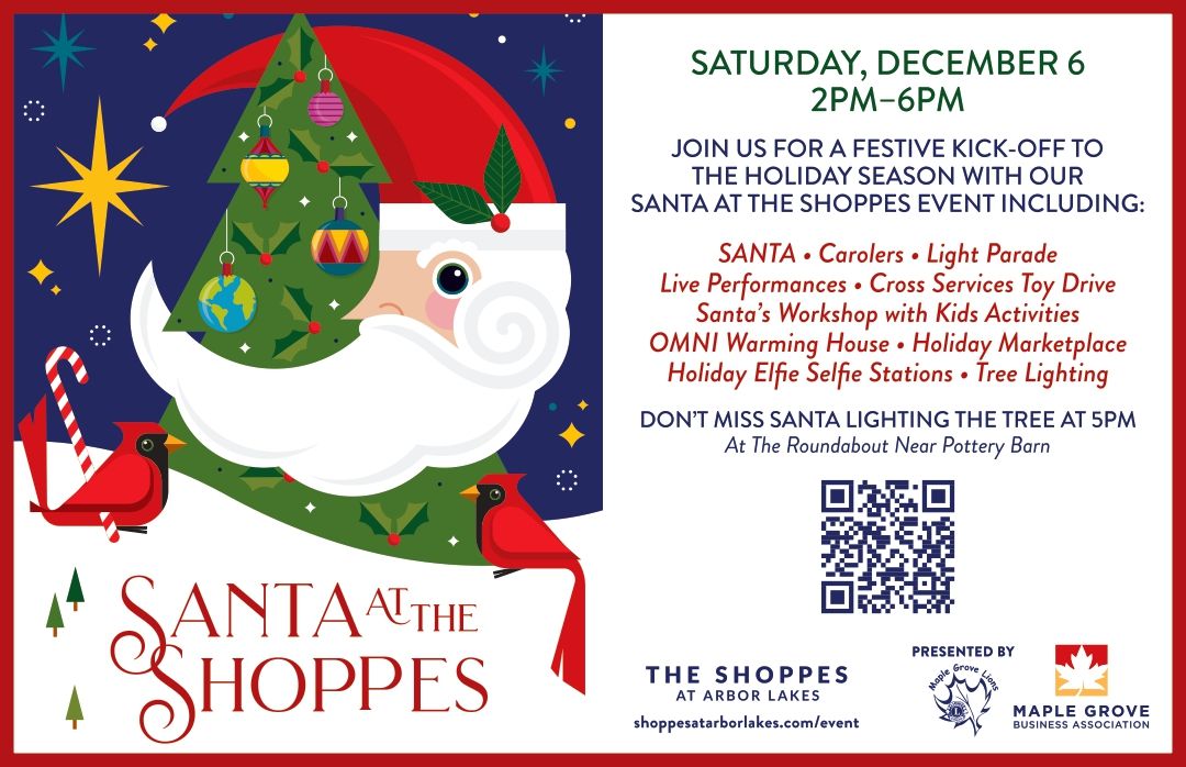 Join us in celebrating the magic of the holiday season by sponsoring the highly anticipated 3rd Annual Santa at The Shoppes presented by the Maple Grove Business Association and The Shoppes at Arbor Lakes on Saturday, December 6, from 2-6 p.m. Filled with Holiday cheer and family fun including the Light Parade, holiday music, Fandazzi Fire Performers, horse-drawn trolley rides, Santa’s Workshop, OMNI Warming house and marketplace, Elfie Selfie Stations, and The Tree Lighting ceremony! By sponsoring Santa at The Shoppes, you have the unique opportunity to align your brand with the joy and magic of the holiday season. Join us in spreading holiday cheer and creating unforgettable memories for families across the Maple Grove community.